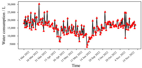 Xi’an City is situated in the Guanzhong Plain of Shaanxi Province. It experiences a warm, temperate, semi-humid continental monsoon climate characterized by four distinct seasons. The water data utilized in this study originated from authentic data sources of DHW in a female student apartment building in a university in Xi’an, China. The data were collected from 1 March to 30 November 2022, of which 17 June to 7 September 2022 was the student holiday period. During this time, only a few students stayed at the school, so the amount of water used was small. The data included the user ID, water consumption time, settlement time, and water consumption amount. The water consumption data corresponding to each period were obtained through the conversion of the water consumption charge standard. Then, the collected water consumption data were used to sort out the hourly water consumption data, that is, the hourly DHW consumption. These data helped us to further perform the DHW consumption analysis and DHW consumption predictions.