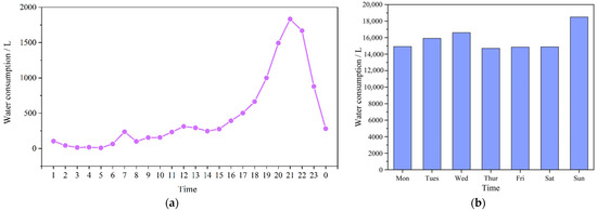 (a) Average daily water consumption per hour during the data collection period; (b) average single-day water consumption from Monday to Sunday during data collection.