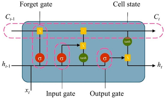 Recurrent neural networks exhibit short-term memory, gradient explosion, gradient disappearance problems, and long-term time dependence. Hochreiter et al. [31] developed the LSTM model to overcome gradient disappearance problems. The LSTM model realizes the modeling of long-term dependencies by introducing three gates to control the input, output, and forgetting of information. As shown in Figure 4, these three gates are the input gate, forget gate, and output gate.