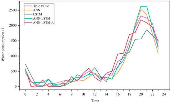 In summary, by observing and comparing the prediction results of four deep learning models, we found that each model may show different accuracies and deviations in the same period. Among the four models, the ANN-LSTM-A model had the first-rate prediction results, which were close to the actual water consumption values. This shows that when processing sequence data, the introduction of the LSTM network could effectively mine the information in the historical data. Simultaneously, the combination of the ANN and LSTM enabled the model to acquire the long-term dependencies of the time series data while learning the high-order features of the data. When the AM was appended, the model could automatically learn key information with a higher accuracy and further improve the prediction effect. Therefore, through comparative analysis, the ANN-LSTM-A model, which combined an ANN, an LSTM, and an AM, exhibited a more accurate prediction ability in predicting water consumption.