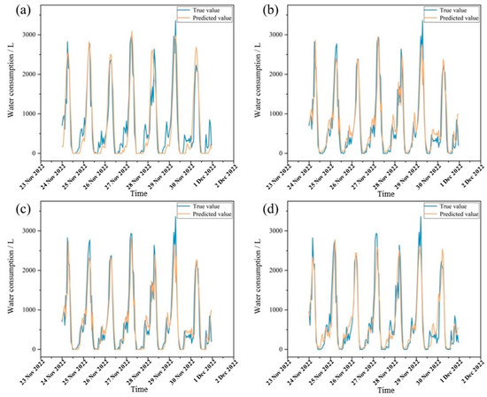 (a) Comparison between the actual and predicted values of the 7-day water consumption for ANN models; (b) Comparison between the actual and predicted values of the 7-day water consumption for LSTM models; (c) Comparison between the actual and predicted values of the 7-day water consumption for ANN-LSTM models; (d) Comparison between the actual and predicted values of the 7-day water consumption for ANN-LSTM-A models.