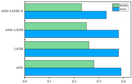 - The test dataset was used to test the determined ANN-LSTM-A model, and the corresponding root mean square error (RMSE) and mean absolute error (MAE) values were calculated.