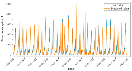 Of the four different deep learning models, i.e., ANN, LSTM, ANN-LSTM, and ANN-LSTM-A, the ANN-LSTM-A model had the first-rate prediction effect. By using the ANN-LSTM-A model for predictions, the water consumption for the month from 1 November to 30 November 2022 was successfully predicted. As shown in Figure 12, from the observed results, it is evident that the model accurately captured the trend and fluctuations in water consumption. In the figure, the specific time series prediction values are compared with the actual values at the same period. The evaluation of the ANN-LSTM-A model reveals a strong fit to the actual data and consistent accuracy in most prediction instances. The results demonstrate that the model effectively predicts DHW consumption with a high level of accuracy.
