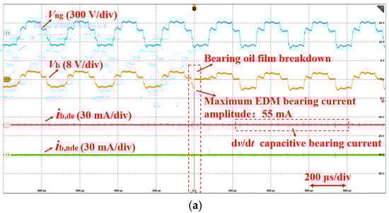 The experimental waveforms are shown in Figure 12. In Figure 12a, the amplitude of Vb is 7.9 V without a common-mode filter, and the maximum amplitude of ib,EDM is 120 mA. Vb is located in zone ② of Figure 6. In Figure 12b, after using a common-mode filter, the measured amplitude of Vb is 3.1 V, and Vb is located in zone ④ of Figure 6, which is reduced to 0.49 times of the reference value Vb* = 6.3 V. By using a common-mode filter, significant attenuation of Vb is obtained, and no discharge of oil film occurs during the experiment.