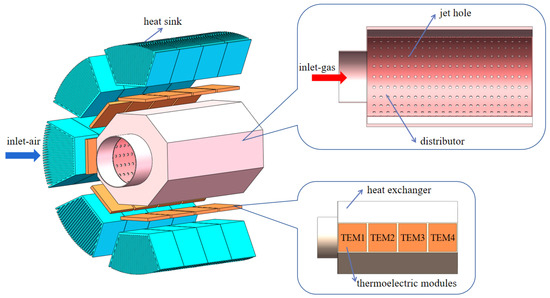 The utilization and recovery of energy highly depend on the heat transfer performance of TEG devices. This study simulated a cylindrical TEG device to investigate the impact of various structural distributors and jet holes on its heat transfer performance. Additionally, the degree of influence of different directions of the cooling air flow on the heat transfer performance of the TEG device was discussed. The key findings are as follows: