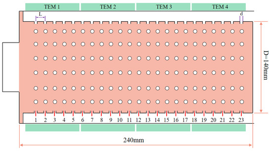 The TEM of the flat-plate TEG is placed on the upper layer of the hot-end shell, whereas its cold end is positioned on the surface. This arrangement ultimately creates a box-like structure for the entire device. Bai et al. [13] designed six different exhaust HEXs: one with an inclined plate structure, one with a parallel plate structure, one with an independent plate structure with holes, one with a series plate structure, and one with a new tube structure in the same shell. Quan et al. [14] designed a new fishbone HEX in which the surface temperature distribution is more uniform in the transverse direction, with a distinct gradual contraction between the front and rear surfaces. Liu et al. [15] developed a power generation device with a flat-plate design. Chaotic fins were employed in this innovative device employed to enhance heat transfer, and the device’s performance was analyzed using computational fluid dynamics (CFD) simulations. Their research revealed a noteworthy 20% decrease in the pressure drop. Similarly, Fernandez et al. [16] proposed a power generation device featuring diffusers at both the outlet and entrance points. The number of fins and the distance between the diffusers and fins were determined via a simulation. CFD simulations were used to determine the size and number of fins and optimize the hot spot conversion efficiency of the plate-type HEX designed by Kim et al. [17].