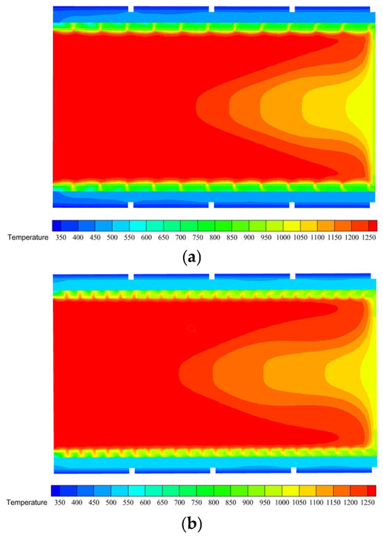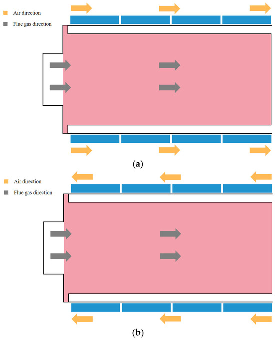 Temperature distribution of the cooling air in different flow directions. (a) Flow of the cooling air and flue gas in the same direction; (b) flow of the cooling air and flue gas in opposite directions.