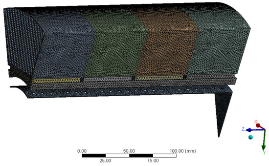The grid independence check is a test used to determine whether or not calculated results are related to mesh density. It is a key step in finite element analysis. The optimization degree of mesh quality is positively correlated with the accuracy of the simulation results. The usual method is to increase the grid count by a percentage to a specific value, and then to increase the grid count so that the calculation results change little or experience no change, because a small number of grids will cause the calculation results to be inaccurate and increase the error; when the number of grids is relatively dense, the accuracy of the calculation results can be improved. However, when the number of grids overflows, it will not only have little effect on improving calculation accuracy, but will also cause the grids to occupy a lot of computer resources, resulting in a significant decline in computing efficiency. Therefore, the grid independence test can make up for the deficiency of the test data to some extent. In this study, Ansys-Mesh (2022 R1) software was used to divide the unstructured grid of the thermoelectric power generation device, and the grid near the fin gap, narrow angle, and distribution hole was encrypted. For the area with a solid material structure such as the collector, a relatively large grid was used. The overall grid of the device presents a hierarchical layout with different regional densities.