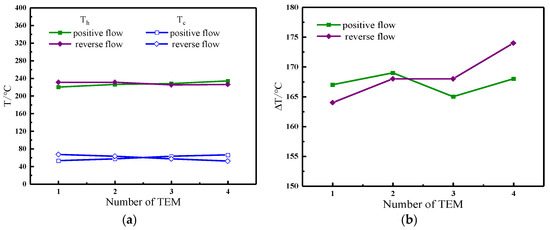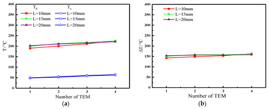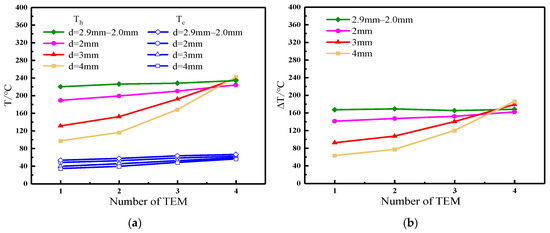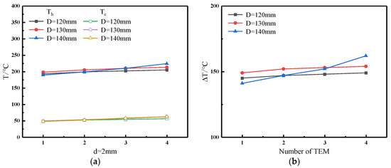 Temperature of TEMS at different distributor diameters (d = 2 mm). (a) Th and Tc of TEMs; (b) ΔT of TEMs.