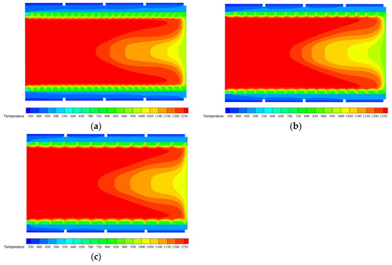 Temperature distribution at different distances between jet holes: (a) L = 10 mm; (b) L = 15 mm; (c) L = 20 mm.