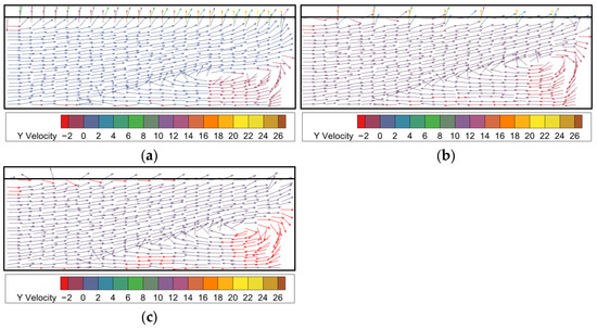 Flow field distribution under different distances between jet holes: (a) L = 10 mm; (b) L = 15 mm; (c) L = 20 mm.