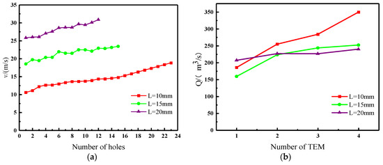 Influence of distance between jet holes on the velocity and flow rate of flue gas. (a) Velocity of flue gas; (b) flow rate of flue gas.