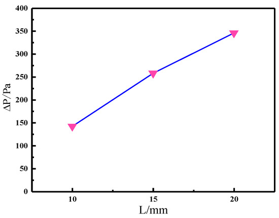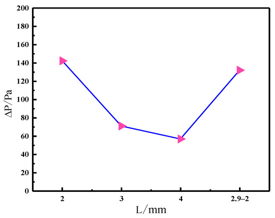 As depicted in Figure 11, the decrease in exhaust pressure through the jet orifice substantially increased as the spacing between the jet orifices increased. The smallest exhaust pressure drops of P = 145 Pa were observed when the distance between jet holes was L = 10 mm. When the hole spacing increased to L = 15 mm, this value was P = 258 Pa. Under a larger hole spacing of L = 20 mm, this value was P = 345 Pa, with a significant pressure difference of 200 Pa detected between L = 10 and 20 mm. This phenomenon is attributed to the decrease in quantity as the distance between jet holes expands, despite the constant inflow of flue gas into the distributor. Consequently, the exhaust pressure drop increased with an increase in the distance between jet holes.