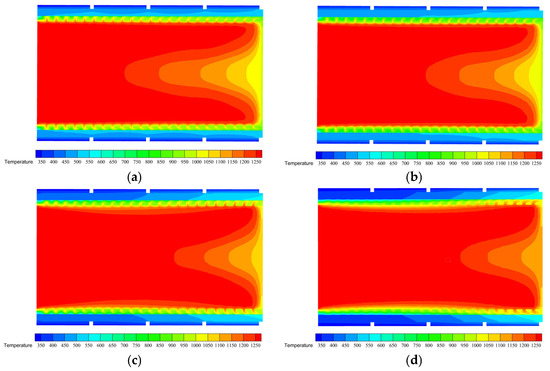 Temperature distribution under different jet hole diameters: (a) d = 2.9–2.0 mm; (b) d = 2 mm; (c) d = 3 mm; (d) d = 4 mm.