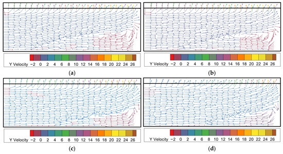 Flow field distribution under different jet hole diameters: (a) d = 2.9–2.0 mm; (b) d = 2 mm; (c) d = 3 mm; (d) d = 4 mm.