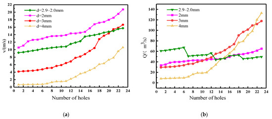 Effect of jet hole diameter on the velocity and flow rate of flue gas. (a) Velocity of flue gas; (b) flow rate of flue gas.