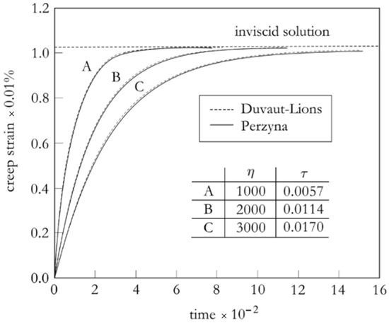 Comparison of axial creep strain with time—two viscoplastic models. Units: is in MPa3·h; and time are in hours [12].