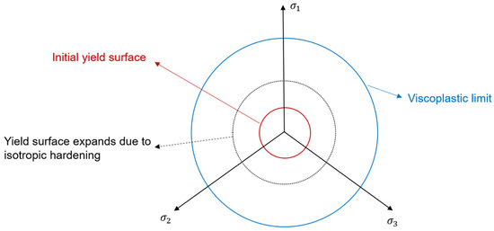 When the von Mises equivalent stress is less than or equal to the initial yield stress (, ), the viscoplastic strain rate is 0, and accordingly, the viscoplastic strain is also 0. When the von Mises equivalent stress is greater than the initial yield stress (, ), viscoplastic strain rate is generated, and viscoplastic strain accumulates accordingly (the yield surface expands due to isotropic hardening). The magnitude of the viscoplastic strain rate is , substituting (6) into