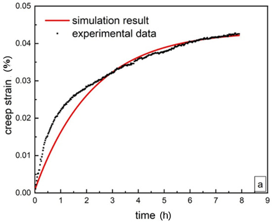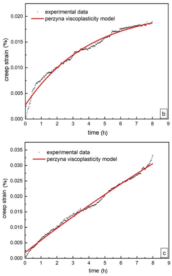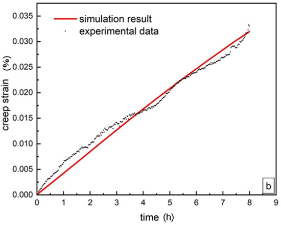 As shown in Figure 7a, during the decay creep stage, there is a gap between the numerical calculation results of the viscoplastic model and the experimental data. After entering the steady-state creep stage (about 3 h), the simulation results agree with the experimental data. As shown in Figure 7b, the numerical calculation results of the viscoplastic model are in good agreement with the experimental data.