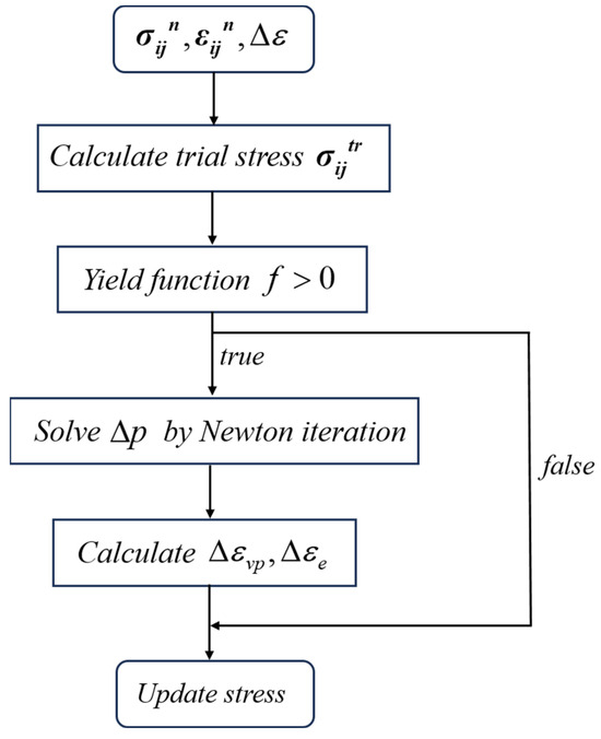 The elastic–viscoplastic constitutive model is programmed into the software platform using the return mapping algorithm [30]. The algorithm is divided into two steps: the first step is elastic prediction, and the second step is inelastic correction [26].