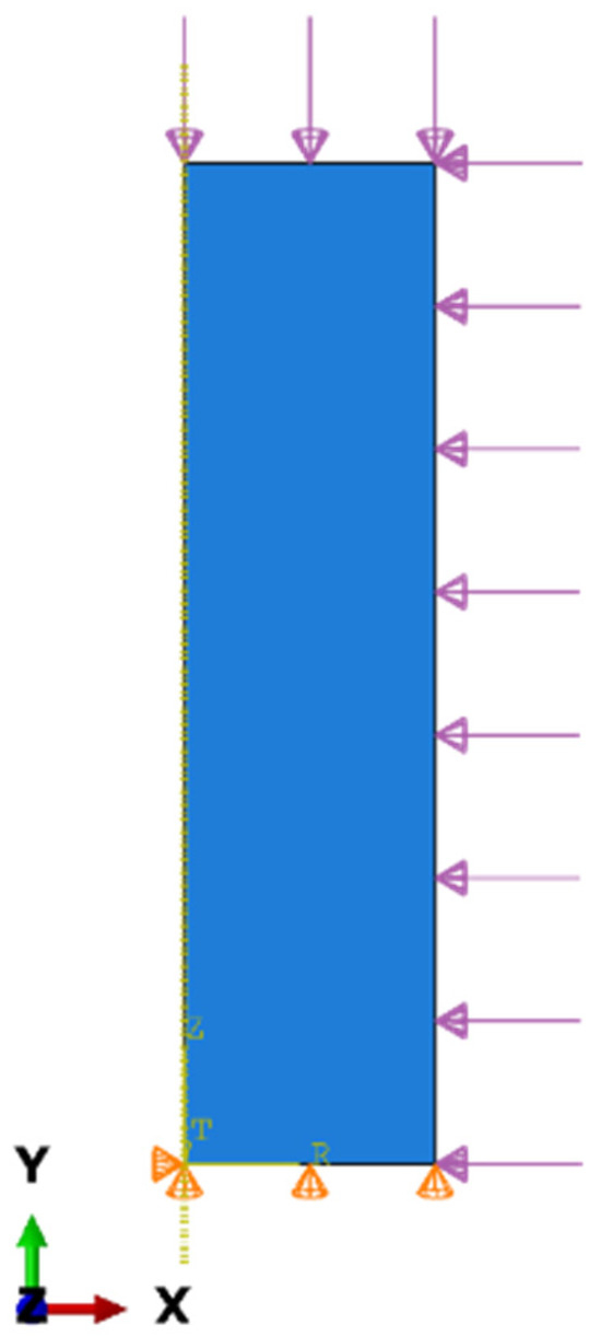In this study, we simulate numerical creep experiments under triaxial loading to verify the correctness of the viscoplastic constitutive relationship. Using the axisymmetric model shown in Figure 6, the leftmost dashed line in the figure represents the axis of symmetry. In order to compare with the experimental data, the geometric dimensions, loads, and boundary conditions were set the same as those of the shale sample creep experiment. The elastic parameters are taken as Young’s modulus E = 25 GPa and Poisson’s ratio ν = 0.3. The parameters of the viscoplastic material are determined by fitting the viscoplastic constitutive model to the first set of experimental data and the third set of experimental data.