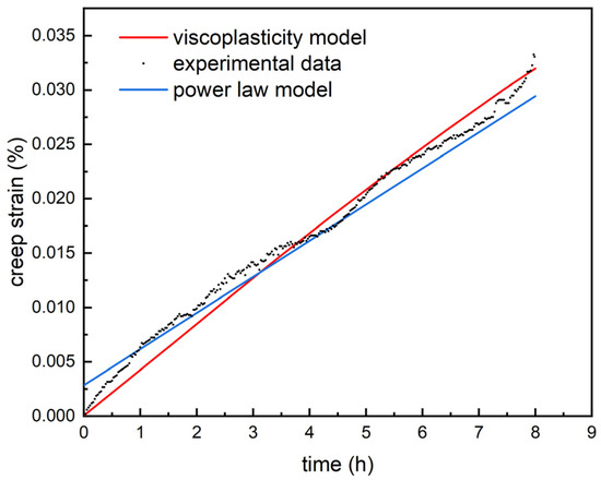 Figure 8 compares the simulation results of the viscoplastic model and the power law model inherent in the software platform and the third set of experimental data. As shown in the figure, both the viscoplastic model and the power law model are in good agreement with the creep experimental results.