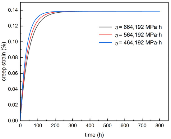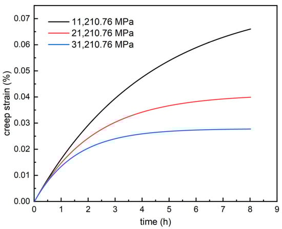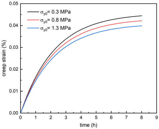 In Figure 9, under certain other conditions, as the viscosity parameter increases, the creep strain rate decreases, and the time to reach the “limit” of creep strain extends. That is, the viscosity parameter only affects the time to reach the maximum creep strain and does not affect the final creep strain. When the viscosity parameter is set, the creep strain limit is closer to the initial yield surface—that is, the viscoplastic solution is closer to the “pure” plastic solution [29]. As shown in Figure 10, under certain other conditions, the larger the initial yield stress, the smaller the creep strain rate and creep strain. For every 0.5 MPa increase in initial stress, the creep strain decreases by approximately 0.23 × 10−4. As shown in Figure 11, under certain other conditions, as the strengthening material parameters increase, the creep strain decreases. Furthermore, there is a non-linear relationship between creep strain and strengthening material parameters.
