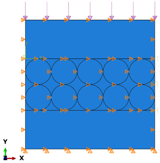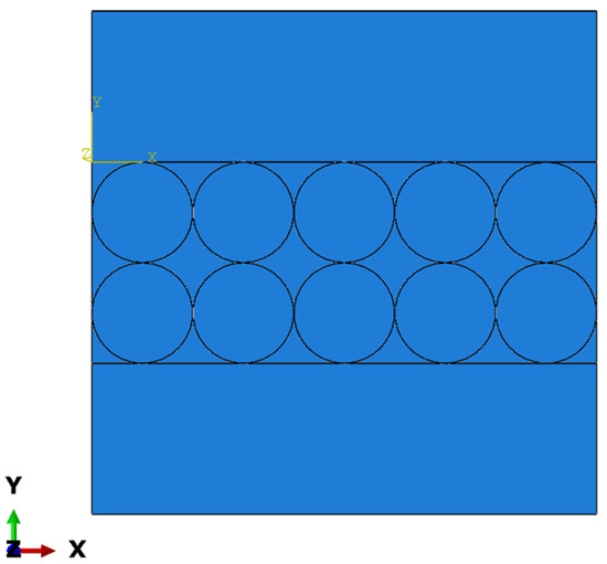 Figure 12 shows the geometric model of the rock fracture system. Shale reservoirs are located above and below, with proppant-filled layers between the reservoirs. The circular particles in the middle are relatively larger proppant particles (double-layer proppant is used here). The intermediate layer is in contact with the relatively larger proppants of the upper and lower reservoirs (the following proppants refer to larger proppants). The reservoir is 1.5 cm thick, with a fracture length of 5 cm, a width of 2 cm, and a proppant radius of 5 mm. Except for the CPE4P element, which is a seepage displacement coupling element with pore pressure degrees of freedom, all other components use the CPE4 element.