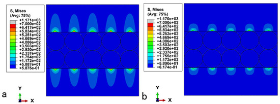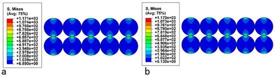 Based on Figure 14 and Figure 15, it can be seen that the von Mises stress in the contact area between the upper and lower layers of the proppant is the highest, with a maximum von Mises stress of 1151.19 MPa. The von Mises stress in the contact area between the proppant and the upper and lower reservoir rocks is secondary, with a maximum von Mises stress of 854.54 MPa. This is mainly because the elastic moduli of the upper and lower layers of proppants are equal, and they are less prone to deformation when in contact. The elastic modulus of the proppant is slightly higher than that of shale, and the contact between the two is relatively prone to deformation. Moreover, as the closing pressure increases and time passes, the proppant is more likely to be embedded into shale reservoirs.