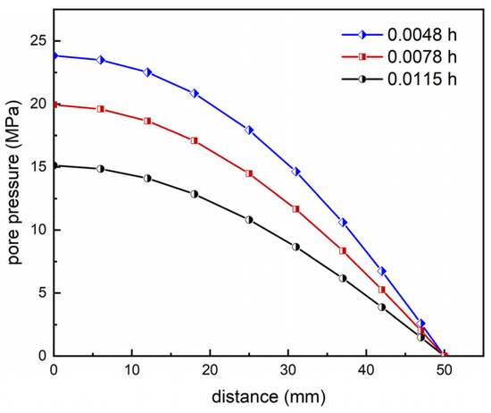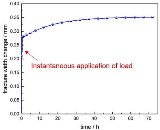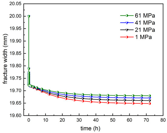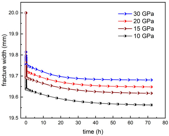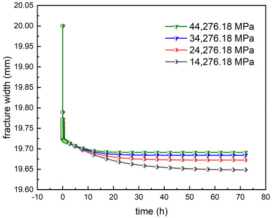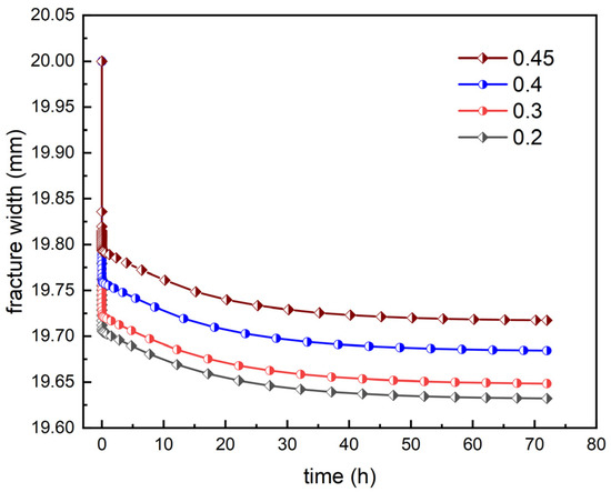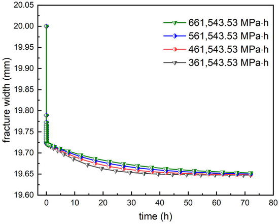 Figure 27 shows the variation in fracture width over time when the strengthening material parameters are h = 14,276.18 MPa, h = 24,276.18 MPa, h = 34,276.18 MPa, and h = 44,276.18 MPa. As shown in the figure, when other conditions are constant, as the strengthening material parameters increase, the fracture width increases. The parameters of strengthening materials mainly affect the process of stress, which no longer changes after the dissipation of pore pressure. Increasing the parameters of strengthening materials is equivalent to increasing the subsequent yield stress, resulting in a decrease in creep strain rate, a decrease in creep strain, and an increase in fracture width. As the variation in pore pressure is small, the variation curves of fracture width with time corresponding to different strengthening materials are not parallel, indicating that the strengthening material parameters are not linearly related to fracture width. This is consistent with the influence of strengthening material parameters on creep strain in Figure 11. Comparing Figure 26 and Figure 27, the influence of strengthening material parameters on seam width is greater than that of initial yield stress on seam width. This is because the initial yield stress is only the “threshold value” for entering viscoplasticity, while the strengthening material parameters affect the entire creep process.