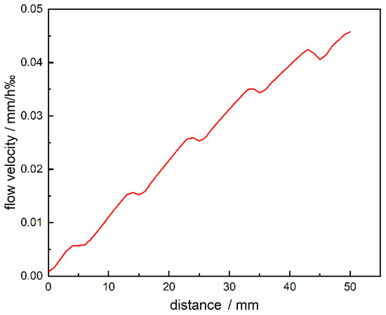 We defined a path along the exit direction of the fracture surface. Figure 17 shows the distribution pattern of pore pressure in the middle layer along the outlet direction of the fracture surface at different times. Obviously, the pore pressure gradually decreases along the direction of the fracture surface outlet, reflecting the process of pore pressure dissipation. Figure 18 shows the distribution pattern of flow velocity along the outlet direction of the fracture surface at the end of the calculation. It is easy to see that the flow velocity gradually increases along the direction of the fracture surface outlet, and the flow velocity at the insertion point of the support agent significantly decreases, which indirectly reflects the decrease in permeability in the embedding area and the decrease in diversion capacity.
