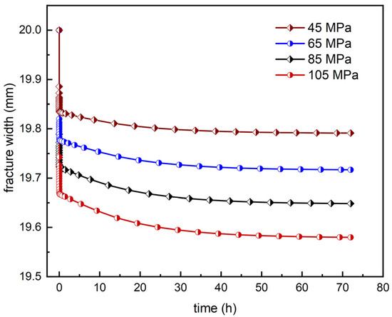 Figure 20 shows the variation in fracture width over time at closure pressures of 45 MPa, 65 MPa, 85 MPa, and 105 MPa. As shown in Figure 20, under certain other conditions, as the closure stress increases, the fracture width gradually decreases. For every 20 MPa increase in closure stress, the fracture width decreases by approximately 0.07 mm. As the closure pressure increases, the time for the fracture width to reach stability is extended. The variation in fracture width can be divided into three stages. At the moment of loading, due to the lack of time for pore pressure to dissipate, the reduction in fracture width is mainly caused by the elastic deformation of the reservoir and proppant. Subsequently, as the pore pressure dissipates, the effective stress on the proppant increases, causing further deformation of the proppant and reservoir, resulting in a decrease in fracture width. After the dissipation of pore pressure, due to the creep properties of the reservoir rock, the reservoir continues to deform, and the fracture width further decreases. As the viscoplastic model of the reservoir is an “upper limit” model, the fracture width will gradually approach a fixed value over time. When the closure stress is increased, it impacts all three stages.