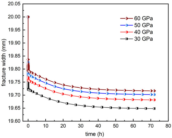 Figure 21 shows the variation in fracture width with time when the elastic moduli of the proppant are 30 GPa, 40 GPa, 50 GPa, and 60 GPa. When other conditions are constant, the larger the elastic modulus of the proppant, the wider the fracture width. This is because the larger the elastic modulus of the proppant, the more effectively it can play its role; that is, the proppant is less likely to deform and embed, and fractures are less likely to close. When the elastic modulus of the proppant increases from 30 GPa to 40 GPa, the decrease in fracture width is greater than when the elastic modulus of the proppant increases from 40 GPa to 50 GPa. This indicates that when the elastic modulus of the proppant increases to a value of around 40 GPa, it can better support fractures. If the elastic modulus of the proppant continues to increase, it cannot significantly reduce the fracture width. When comparing the time-varying curves of the fracture width with different elastic moduli of proppants, the curves are parallel to each other, indicating that the elastic modulus of proppants mainly affects the instantaneous application of closing stress and the early stage of pore pressure dissipation. For the time period after small changes in pore pressure, changes in the elastic modulus of proppants have almost no effect on the fracture width. This is because the change in elastic deformation caused by the change in elastic modulus is not related to the length of time but only to stress.