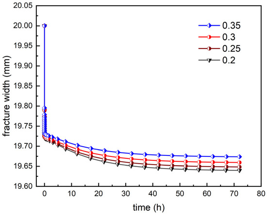 Figure 24 shows the variation in fracture width over time for shale reservoirs with Poisson’s ratios of 0.2, 0.25, 0.3, and 0.35. As shown in the figure, when other conditions are constant, the larger the Poisson’s ratio of the reservoir, the wider the fracture width. The reason for this is the same as the effect of the Poisson’s ratio of the proppant on the fracture width, so it will not be repeated here. The width of the fracture is not linearly proportional to the Poisson’s ratio of the reservoir. When the reservoir Poisson’s ratio increased from 0.2 to 0.25, the fracture width increased by 0.0087 mm; when the reservoir Poisson’s ratio increased from 0.25 to 0.3, the fracture width increased by 0.0111 mm; and when the reservoir Poisson’s ratio increased from 0.3 to 0.35, the fracture width increased by 0.0144 mm. Similarly to Figure 22, the Poisson’s ratio of the reservoir mainly affects the instantaneous application of closure pressure and the early stage of pore pressure dissipation. For the later stage of pore pressure dissipation, the Poisson’s ratio of the reservoir has almost no effect on fracture width.
