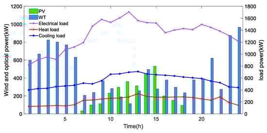 Based on the Chongli Application Demonstration Project, the load and new energy output prediction data in the park are shown in Figure 3. It can be seen from Figure 3 that the wind power resources are sufficient at night and the photovoltaic resources are abundant during the daytime, and their complementarity allows the system to handle the load better. In addition, the electro-thermal cooling load has different demands in the time scale and space scale, and multi-energy complimentary can be realized by using a multi-energy flow coupling mechanism. A small-scale hydrogen load is set in this paper to reflect the economy of hydrogen storage, so that the system can generate income by selling the hydrogen to the outside. The electricity price and natural gas price in the time-sharing purchase from the external grid are shown in Table 2. The parameters related to each piece of equipment in the system are shown in Table 3. The efficiency parameters of the main equipment of the system are shown in Table 4. The parameters of the hydrogen storage system are taken from the literature [40]. The operating parameters of the alkaline EL are detailed in the literature [37]. The model is solved by calling CPLEX of MATLAB with a dispatch cycle of 24 h.