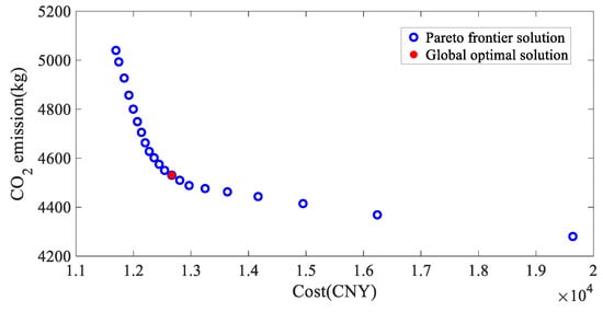 Compared with the NSGA II algorithm, the solution spacing in Figure 9 given by compromise planning is more uniform, and a reasonable trade-off is directly made between the cost and carbon emissions. However, its ability to approach the true Pareto front is weak.