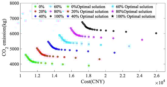 In this section, the source–load robustness factor is varied from 0 to 100% with 20% steps to evaluate the multi-objective solution’s effect with different robustness factors. The Pareto frontier solutions and the optimal solutions for different degrees of robustness are shown in Figure 10.