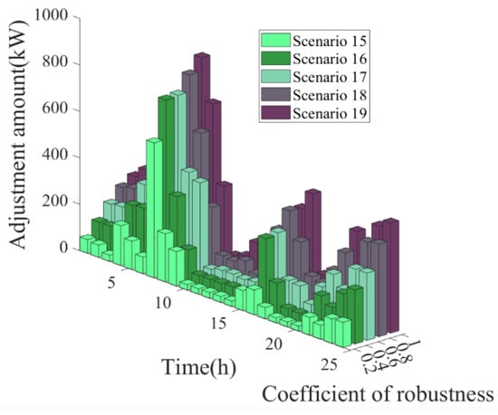 Figure 12 and Table 9 show the unit power adjustments of each time period and the total values with different robustness coefficients for Scenarios 15–19 in Table 7. The total adjustment refers to the sum of the power purchased, the CHP power, and the GB power increased by the uncertainty of the source charge over the deterministic model for 24 h.