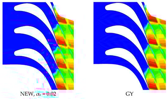 According to Figure 6 and Figure 7, for result validation, the numerical results of the static pressure distribution across the stator and rotor blades are compared with experimental data. Furthermore, the results obtained by the new droplet growth model (red line) are compared with those obtained by the other droplet growth models (black line). In the presented cases, the results obtained by the GY, FS and YO models coincide. Therefore, they appear as a single line in the figures. For the proposed model, we evaluated the effect of different values of αc (condensation coefficient) on the results, and we found that for the stator case αc = 0.02 and for the rotor case αc = 0.05, which matched the experimental data. For this reason, we only present the results for these values. As can be seen in Figure 6 and Figure 7, the new model predicts the condensation shock wave location and intensity more accurately than the other models. The GY, FS and YO models give acceptable results for large droplets (low Knudsen numbers) in the continuous region. However, the new model calibrates the droplet growth for very small droplets (large Knudsen numbers), i.e., just after nucleation. It is thus better than the other models, which tend to underpredict the droplet growth rate. It can be concluded that the new model is applicable for a broad range of Knudsen numbers.