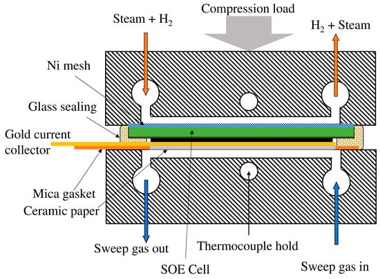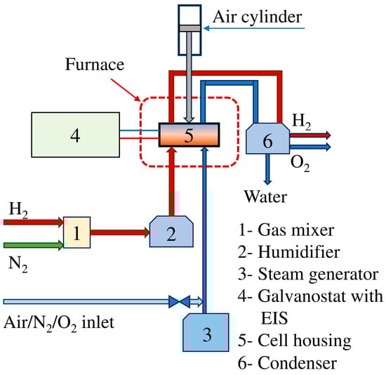 Electrolysis experiments were conducted in a gas-tight housing for 5 cm × 5 cm cells, with a gold grill current collector on the anode side and a nickel net on the cathode side (Figure 1). Housing was made from Crofer 22APU (VDM Metals GmbH, Werdohl, Germany) ferritic steel, which is dedicated to high-temperature electrochemical applications. Cells were sealed at 850 °C using commercially available glass-based sealing under a compression load of 300 N. The gold grill was supported by a mica gasket and ceramic paper, which also ensured electric insulation between the current collector and housing. A nickel net was directly connected to the top part of the housing. The temperature of the cell was controlled by 2 N-type thermocouples. The housing was incorporated in the test rig as schematically presented in Figure 2, which includes a furnace, gas preparation, steam generation equipment, a Zahner Electrochemical Workstation with PP240 and IM6ex modules (Zahner-Elektrik GmbH & Co., Kronach—Gundelsdorf, Germany), and a 4-quadrant potentiostat/galvanostat (±40 A, ±4 V) with an electrochemical impedance spectrometer (10 μHz–3 MHz range). Gas flows were controlled by Bronkhorst El-Flow mass flow controllers (Bronkhorst High-Tech B.V., Gelderland, The Netherlands), while for the preparation of the cathode gas, a precise Cellkraft P-10 laboratory humidifier (Cellkraft AB, Stockholm, Sweden) was used. It allows control humidity of the gas in range of 0–100% RH for the flows up to 10 LN/min at a pressure from atmospheric to 30 bar. Steam as ASG was supplied by aTHMOS precise steam generator (aDROP Feuchtemeßtechnik GmbH, Fürth, Germany). The design of the aTHMOS allowed low-pulsation generation of the 50–50,000 g/h flow of steam with a pressure of up to 6 bar. The usage of Bronkhorst El-Flow mass flow controllers for H2, N2, and O2, a precise humidifier from Cellcraft, and a steam generator from aDROP allowed the production of gas mixtures of the required quality in long-term experiments. A compressor gas cooler (6 at Figure 2) ECM-2 (M&C TechGroup, Ratingen, Germany) was used to avoid uncontrolled condensation of the water in outlet gas channels, which may interfere with electrochemical measurements by uncontrolled pressure pulsation. The test rig was designed for long-term continuous operation with semi-automatic data acquisition.
