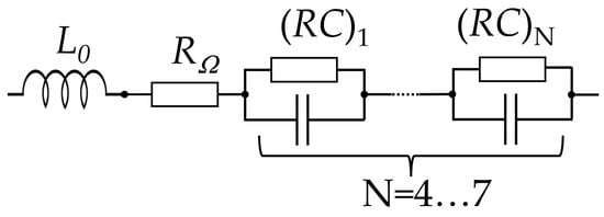 Before the long-term experiments, each cell was characterized at the standard conditions, using air as the ASG and 50% H2O–H2 mixtures as fuel gas (Table 2). The spectrum of each cell can be described as a sequent connection of the parasitic inductance L0, ohmic resistance RΩ related to the resistivity of the electrolyte and electrode layers, and a chain of the 4–7 RC elements, which relates to electrochemical processes (Figure 3):