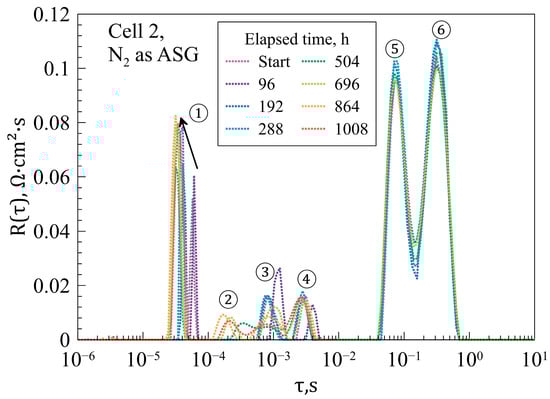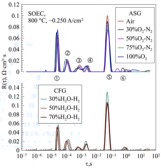 Cell 1 was used to collect data for the interpretation of the DRT spectra. The impedance of the cell was measured for the different gas mixtures in the air cathodic and anodic compartments. These measurements had moderate success (Figure 4): while five peaks are distinctly observable, only peak (3) might be clearly attributed to anodic processes. While the most prominent peak (5) demonstrated mixed reaction, peak (4) likely is associated with the cathode, and low- effects in (1) and (2) do not demonstrate a clear correlation with either ASG or CFG. In general, the “sharing” of the relaxation time constants between electrodes is a known phenomenon []. Vague “slow” effects, labeled as (6), likely should be considered as artifacts, related to the operation of the steam generator, which can be observed on raw electrochemical data (See Supplementary Materials, Figures S3–S5).