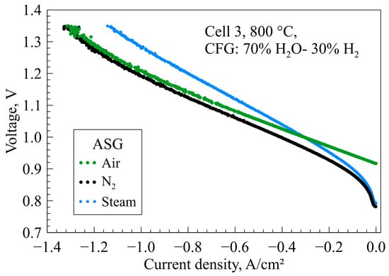 Current–voltage characteristics, collected for Cell 3 with different sweep gases (Figure 5), demonstrated a sufficient difference of the steam as the ASG compared to the “standard” air and nitrogen. While at lower current densities, the differences were mainly governed by different OCV, at higher densities, the voltage on the steam-flushed cell was sufficiently high. However, the use of the steam did not limit the performance of the cell, which reached a current density of almost 1.2 A/cm2 at a voltage below 1.4 V, while practical operating of the current density value in electrolysis did not exceed 1 A/cm2 to avoid cathode degradation due to Ni coarsening [,,].