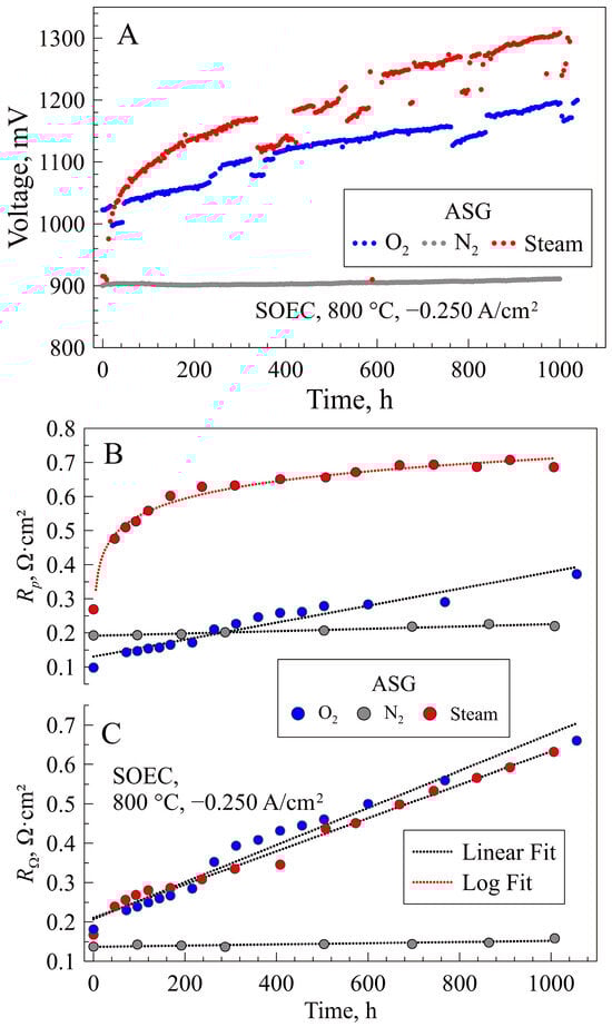 Degradations of the cells with various ASGs. CFG composition was 70% H2O–30% H2. (A) Evolution of the cells voltage under constant current, (B) polarization resistance, and (C) ohmic resistance; Log Fit denotes fit to model . Fits are presented for visual guidance. Notched voltage plots for steam and O2 in (A) are related to the EIS measurements and minor dysfunction of the control box. For N2, these effects were eliminated.