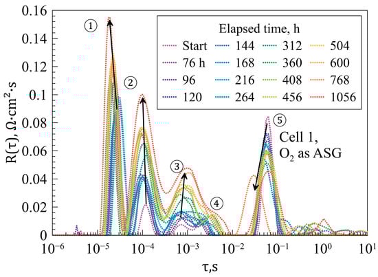 Evolution of the DRT of the SOEC with oxygen as the anode sweep gas. Electrolysis conditions: 800 °C, −0.25 A/cm2, and CFG: 70% H2O–30% H2.