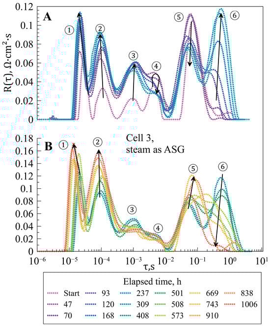 Evolution of the DRT of the SOEC with steam as the anode sweep gas. (A) First 309 h and (B) the rest of the 1000 h term. Electrolysis conditions: 800 °C, −0.25 A/cm2, and CFG: 70% H2O–30% H2.