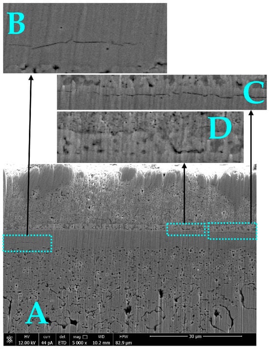 Cell 3 cross-section after 1000 h of operation under −0.25 A/cm2 current, with steam as the ASG. (A) Full view, (B) crack in YSZ membrane, (C) crack in GDC-YSZ interface, and (D) crack in GDC-YSZ interface, propagated to LSCF-GDC border.