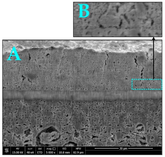 Cell 3 cross-section after 1000 h of operation under −0.25 A/cm2 current with oxygen as ASG. (A) Full view and (B) crack on LSCF-GDC border.