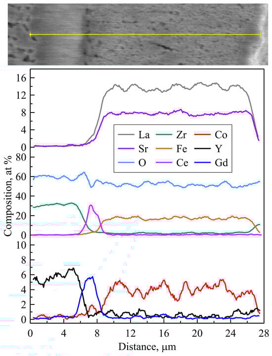 The post-mortem analysis of the studied cells was performed using the Versa 3D (FEI) high-resolution scanning electron microscope with an EDX detector (Carl Zeiss AG, Oberkochen, Germany). The preparation of the cell cross-sections was performed using a Hitachi IM4000Plus ion polisher (Hitachi High-Tech Corp., Ibaraki, Japan), which allows the prevention of adscititious delamination and rupture of the porous ceramic layers. X-ray diffraction experiments were conducted on CuKα radiation in the 2Θ range of 10–110° with step 0.013° using a Panalytical Empyrean diffractometer with a PIXcell3D detector (Malvern Panalytical Ltd., Malvern, UK).
