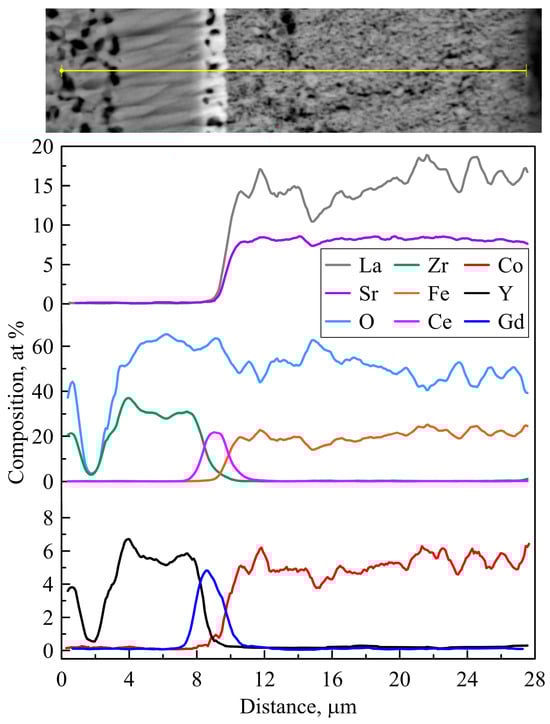 After measurements, the cells were extracted from the housing and prepared for SEM analysis using an ion polishing device to avoid corruption of the microstructure. Cell 3 demonstrated minor tangential cracks in the YSZ, YSZ–GDC, and GDC–LSCF interfaces, which can be seen in Figure 10.